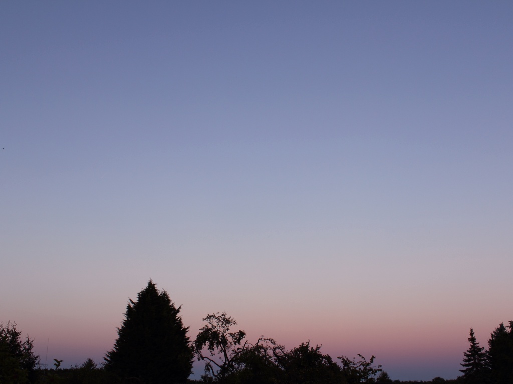 Dominant erscheinen 6 etwa gleich helle Sterne, dazwischen blitzen gelegentlich 3 kleine Lichtpünktchen auf. Zwar kein Vergleich mit Kembles Kaskade, aber trotzdem hübsch. 22:30 Uhr. Es ist immer noch warm. Trockene, szintillationsfreie Luft, keine Mücken oder ähnliches Ungemach, nicht mal Hundebellen, Schafsblöken oder Entenschnattern. Lediglich der leise vor sich hin dudelnde TV mit meiner davor sitzenden Frau wenige Meter hinter mir im abgedunkelten Gartenpavillon. Allein unter Sternen und trotzdem nicht einsam! Ein wohliger Schauer durchfährt mich. Noch ein ausgiebiger Blick auf den phantastischen Nachthimmel, bevor ich mich samt Dobson in den Pavillon zurückziehe ...