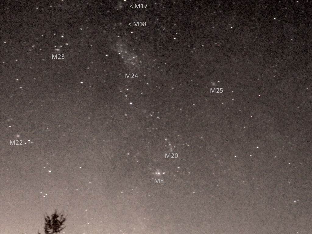 Um mich nicht ständig zu wiederholen, die phantastischen Bedingungen gelten auch für die folgenden Berichte - lauwarmer Ostwind, stahlblauer Himmel, Wahnsinns-Seeing. Heute folgen bescheidene Versuche in der Astrophotographie, die Konjunktion von Mars, Antares und Saturn will ich mit dem Sensor meiner EOS 600D für die Nachwelt dokumentieren. Auch hier ein holpriger Start, nach umfangreichen Renovierungen im Haus und den damit verbundenen Umräumaktionen mussten wir erstmal das Stativ für die Kamera suchen, aha, es versteckte sich unter dem Doppelbett im Zimmer hinten oben. Am Südfenster der oberen Etage hurtig die Kamera auf dem Stativ montiert und ein paar einfache One-Shot-Aufnahmen mit unterschiedlicher Belichtungszeit erstellt. Obwohl die exorbitant helle Lichtglocke von Wittenberg das Ergebnis schmälert, gelang folgendes Bild: Mars knapp über dem Gegenmars Antares, schräg darüber Saturn. Schön erscheinen auch die Scheren des Skorpions vor einem fast grünlichen Hintergrund. Airglow? Das wäre ja der Hammer, die erste Aufnahme dieses Lichtphänomens! Und tatsächlich, bei höherer Vergrößerung (bitte auf das Bild klicken) ist das Grün nicht zu übersehen. Als "Abfallprodukt" der 15s-Belichtung erscheinen am linken Bildrand die sich im Schützen versteckenden Messier- Objekte. Diese kitzele ich mit einer extremen Nachbearbeitung aus dem im raw-Format aufgenommenen Bild aus der Wittenberger Lichtglocke heraus: Besonders hell leuchtet der Lagunennebel M8 mit integriertem NGC 6530, aber auch die anderen Messier-Flecken befinden sich noch ordnungsgemäß an Ort und Stelle. Es ist immer noch warm bei ganz leichtem Ostwind, aber den Dobson lasse ich heute nach den nervenraubenden Belichtungsreihen mal im Pavillon stehen. Astrophotographie und visuelle Beobachtung im Teleskop gleichzeitig ist in der Tat doppelter Stress, stelle ich gerade fest. Noch ein schneller Blick auf Collinder 399 (Kleiderbügelhaufen) mit dem Fernglas, na ja, nicht gerade überzeugend. Im Gegensatz dazu eine klasse Milchstraße, Kohlensack im Schwan und Great Rift kristallklar, sogar die Schildwolke schält sich im Süden heraus. So, genug für heute ...