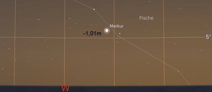 Merkur steht jetzt etwa auf der gleichen Höhe wie Venus, seine Helligkeit nimmt bereits deutlich ab, er hat mit -0,59 mag nur noch die Hälfte der Helligkeit vom 29.03.2010.